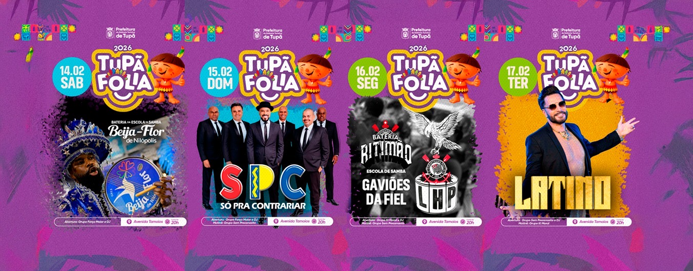 NEWS Tupã Folia 2026 terá shows com Latino, SPC e grandes Escolas de Samba O Tupã Folia 2026 será Continue Lendo »